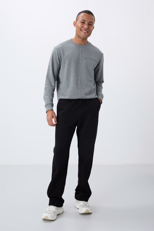 Black Cotton Thick Fleece-Lined Soft Textured Oversize Embroidered Men's Tracksuit Bottom -82146