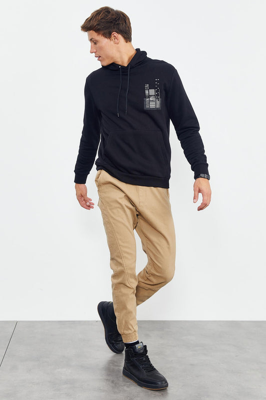 Black Embroidered Kangaroo Pocket Hooded Regular Fit Men's Fleece Sweatshirt - 88156