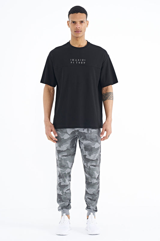 Black Embroidered Oversize O Collar Men's T-Shirt - 88178