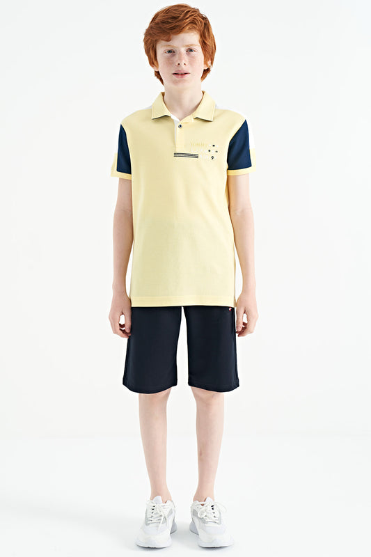 Yellow Color Block Embroidered Letter Detailed Standard Pattern Polo Collar Boys T-Shirt - 11109