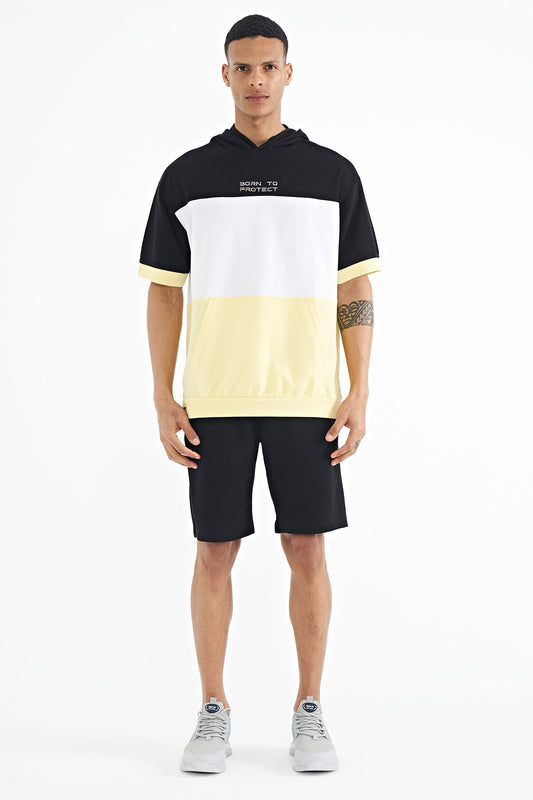 Yellow Hooded Print Detailed Oversize Men's T-shirt - 88191