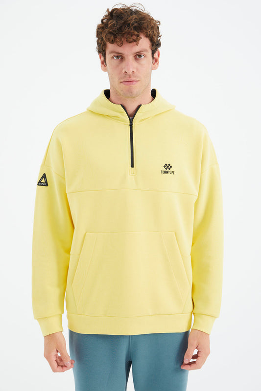 Yellow Hooded Half-Zip Pocket Detailed Relax Fit Men's Sweatshirt - 88294