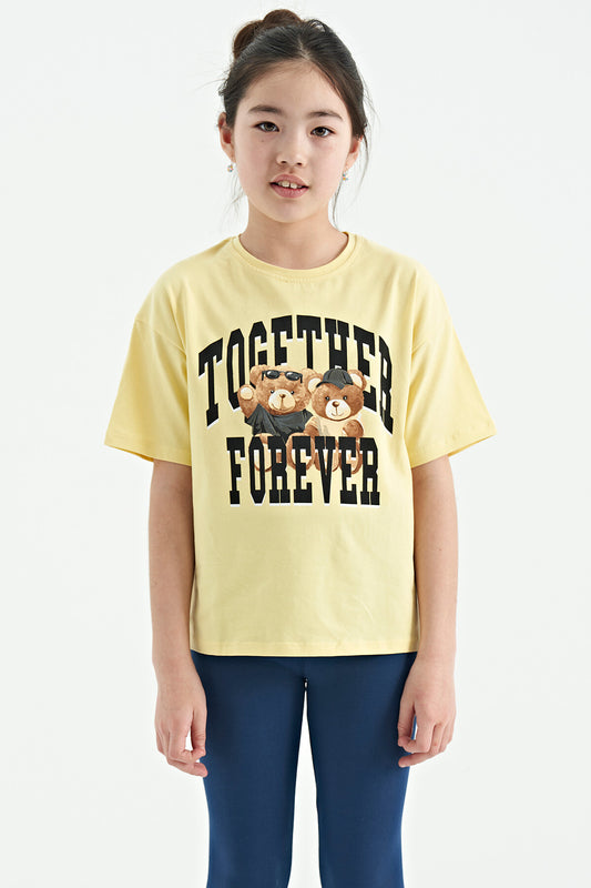 Yellow Teddy Bear Print O Collar Oversize Short Sleeve Girls' T-Shirt - 75116
