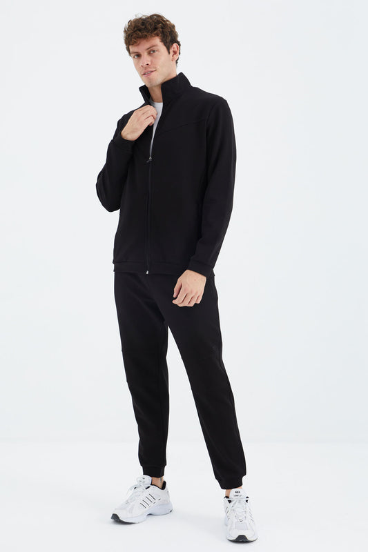 Black Stand Collar Zippered Comfort Fit Classic Cuff Men's Tracksuit Set - 85072