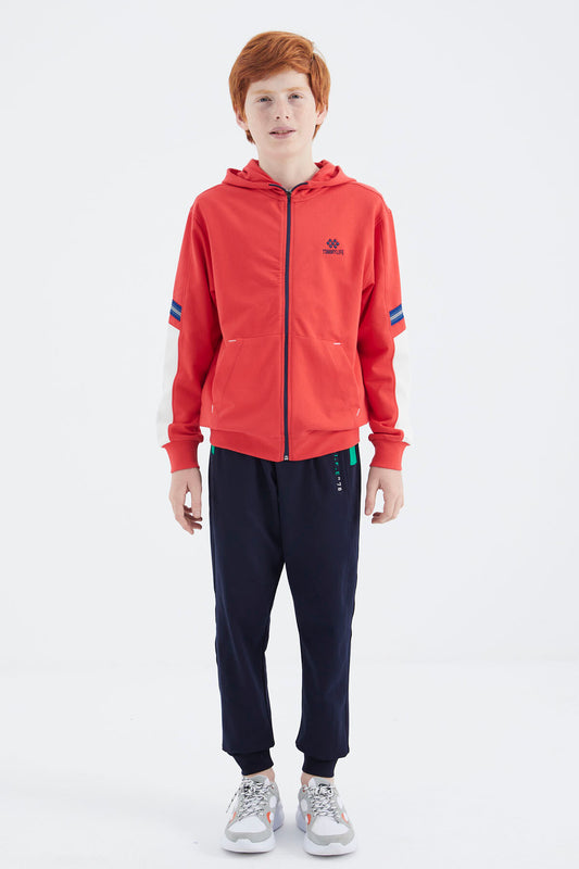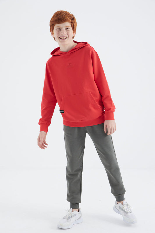 Red Thick Soft Textured Standard Fit Embroidered Fleece Boys' Sweatshirt - 11223
