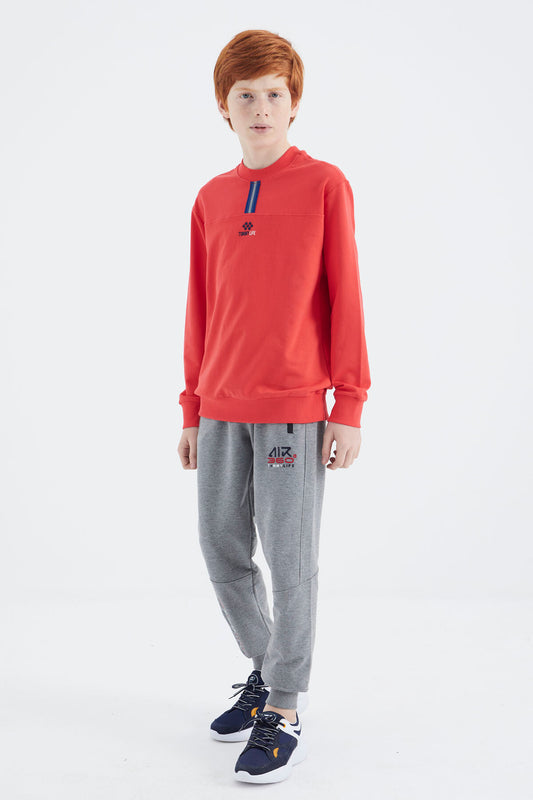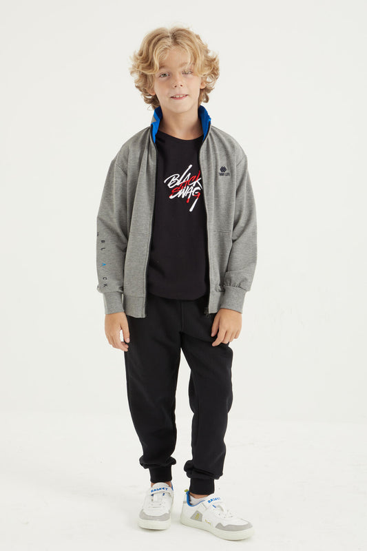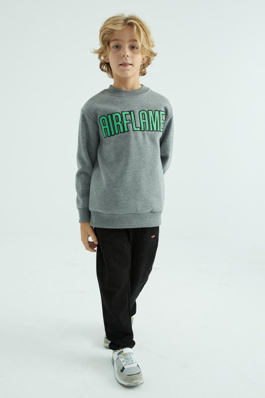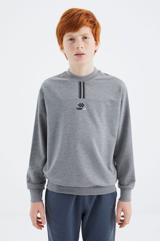 Grey Melange Print Embroidered O Collar Standard Fit Boys' Sweatshirt - 10987