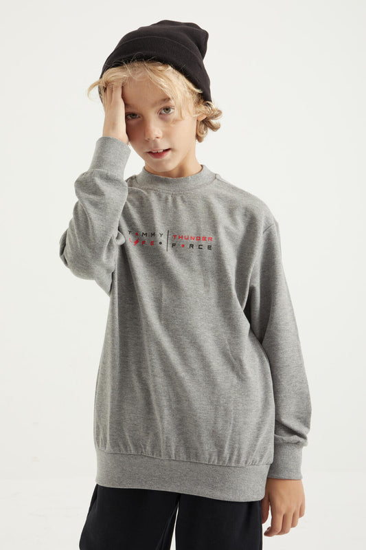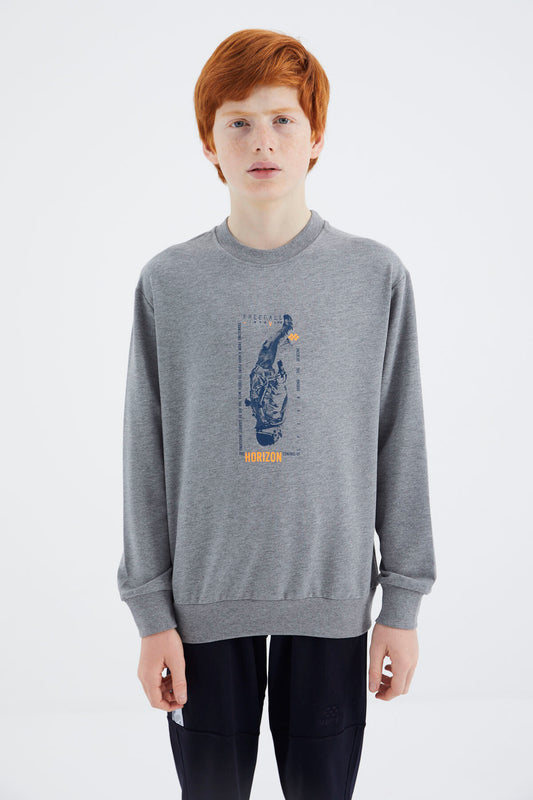 Grey Melange Back Print O Neck Standard Fit Boys' Sweatshirt - 11026
