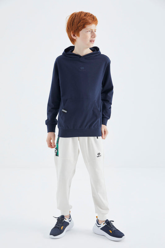 Navy Blue Printed Kangaroo Pocket Hooded Standard Fit Boys' Sweatshirt - 11002
