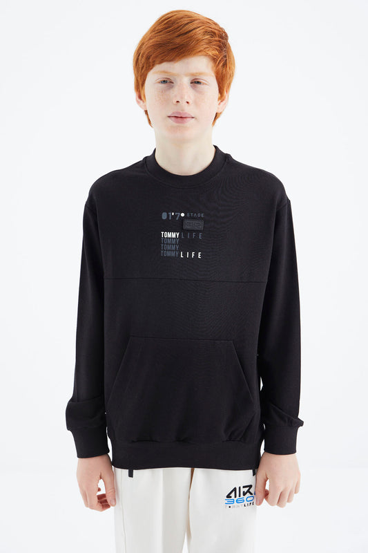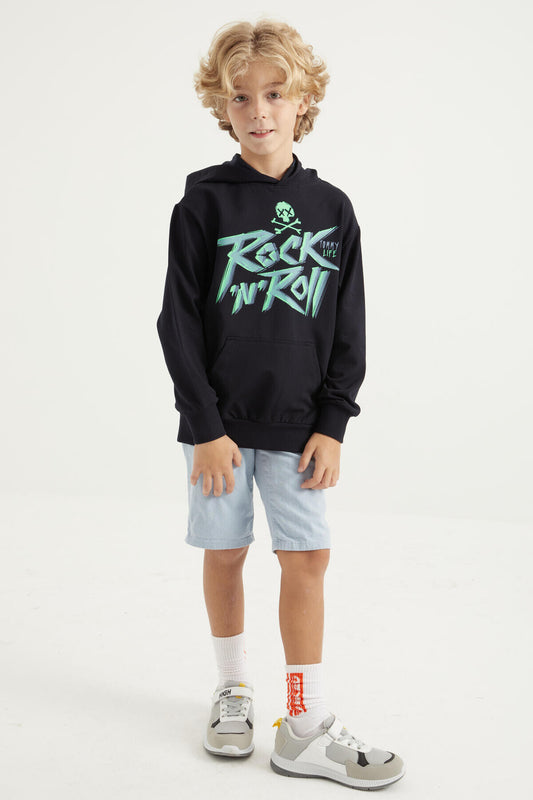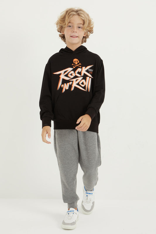 Black Print Kangaroo Pocket Hooded Standard Fit Boys' Sweatshirt - 11002