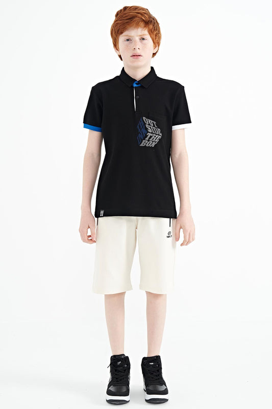 Black Front Detailed Printed Standard Fit Polo Collar Boys T-Shirt - 11102