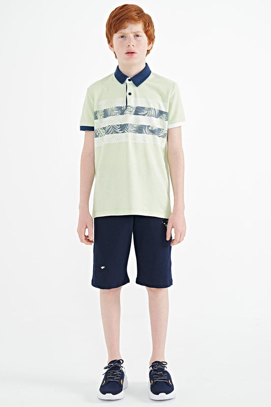 Light Green Print Detailed Standard Cut Polo Collar Boys T-Shirt - 11101