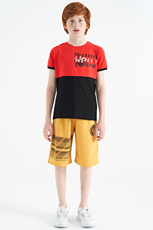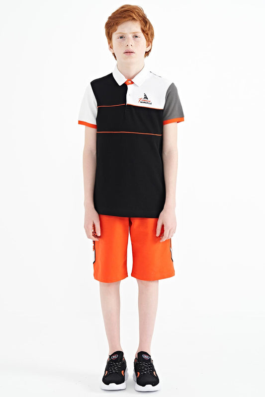 Orange Collar Color Block Print Detailed Standard Cut Boys T-Shirt - 11111