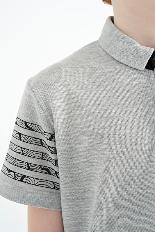 Grey Melange Collar Printed Detailed Standard Mold Polo Collar Boys T-Shirt - 11093