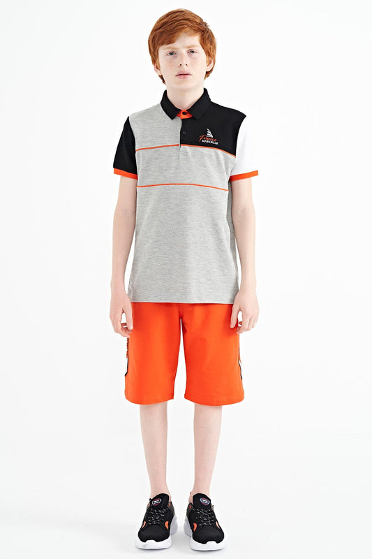 Grey Color Block Embroidered Letter Detailed Standard Pattern Polo Collar Boys T-Shirt - 11109