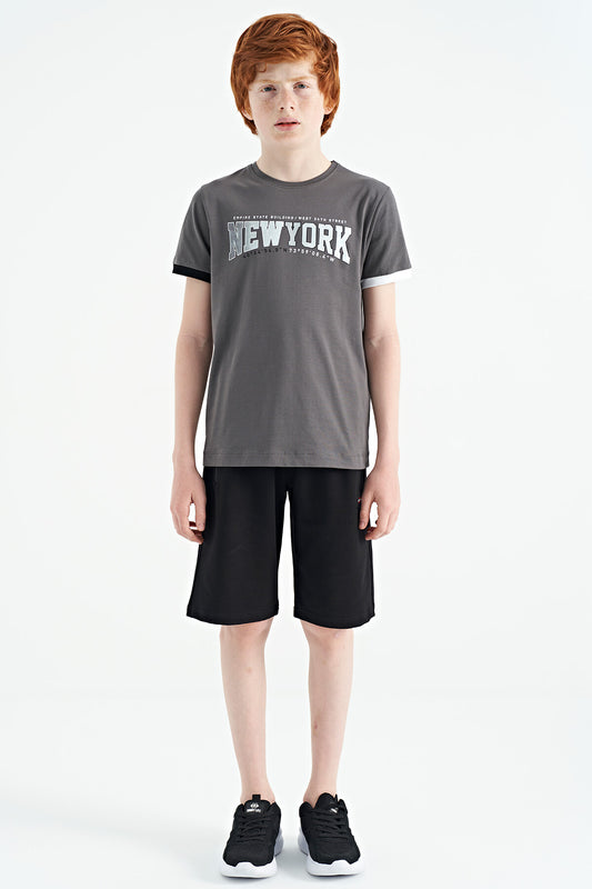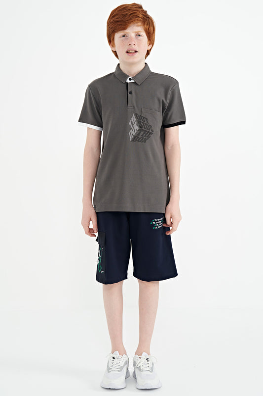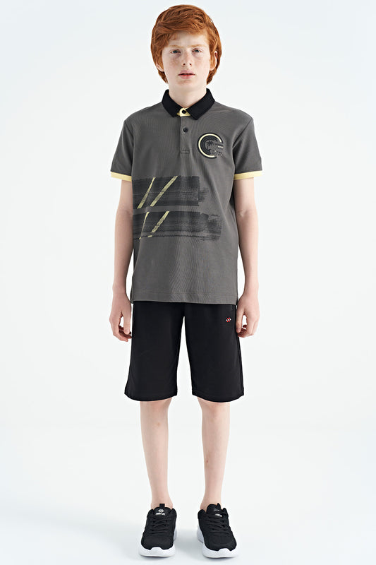 Dark Grey Front Detailed Print Standard Fit Polo Collar Boys' T-Shirt - 11102