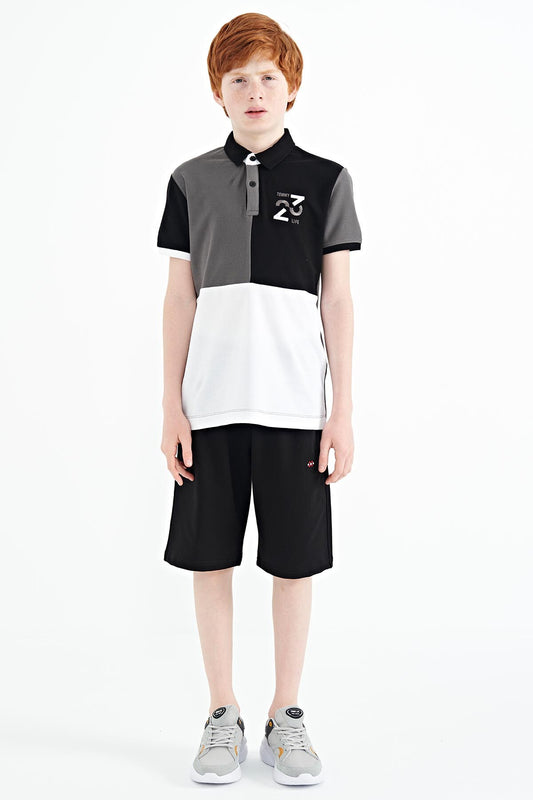 Black Color Block Embroidered Letter Detailed Standard Pattern Polo Collar Boys' T-Shirt - 11109
