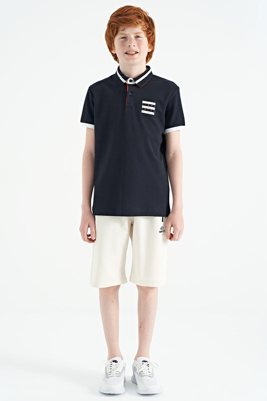 Navy Blue Cuff Print Detailed Standard Cut Polo Collar Boys T-Shirt - 11093