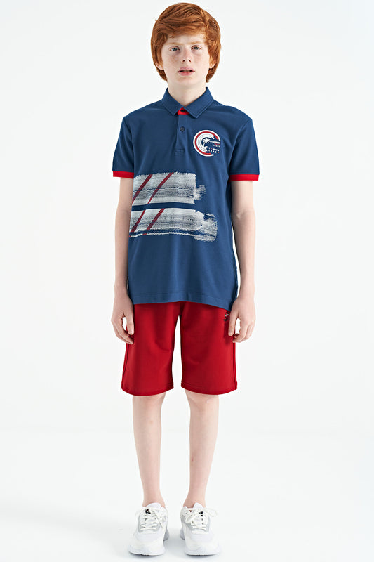 Indigo Print Detailed Polo Collar Standard Fit Boys' T-Shirt - 11094