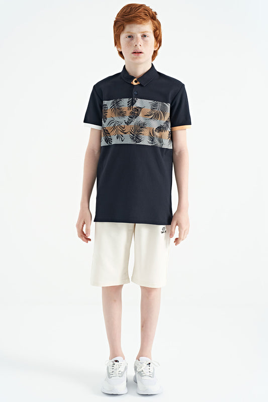 Navy Blue Printed Detailed Standard Fit Polo Collar Boys T-Shirt - 11101