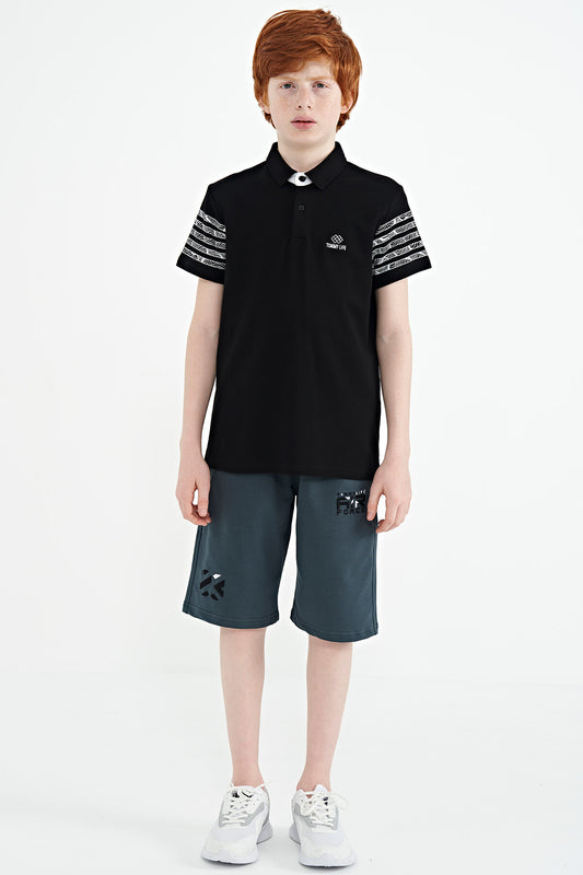 Black Printed Cuff Detailed Standard Mold Polo Collar Boys' T-Shirt - 11093