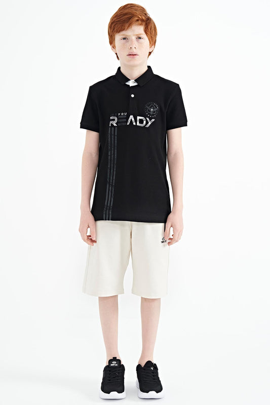Black Print Pattern Standard Fit Polo Collar Boys' T-Shirt - 11143