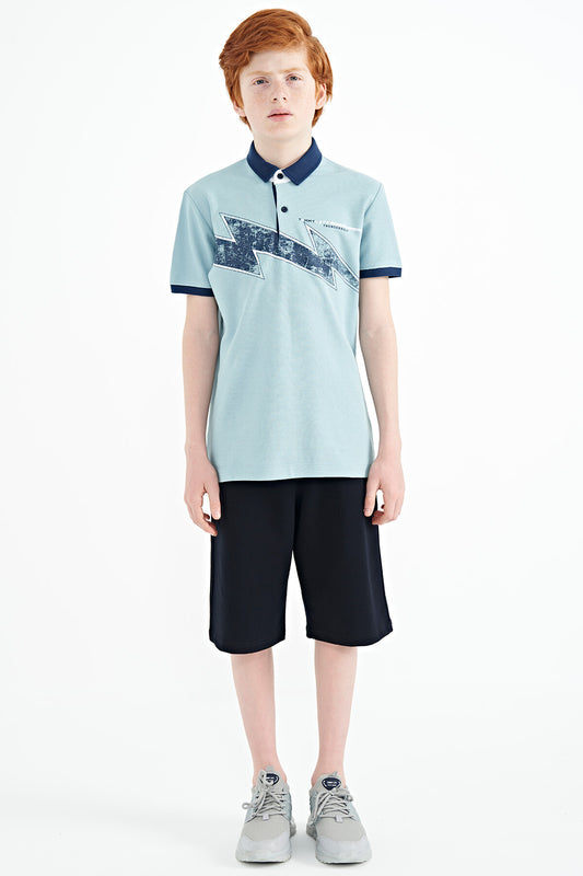 Light Blue Print Detailed Standard Cut Polo Collar Boys T-Shirt - 11154