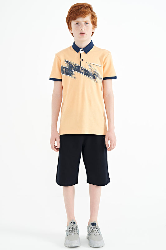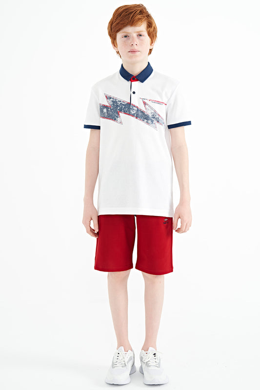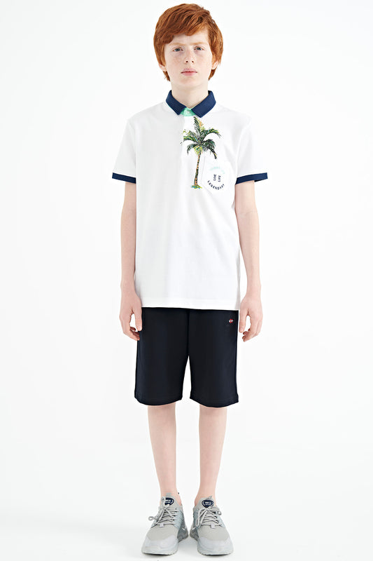 White Print Detailed Standard Fit Polo Collar Boys T-Shirt - 11154