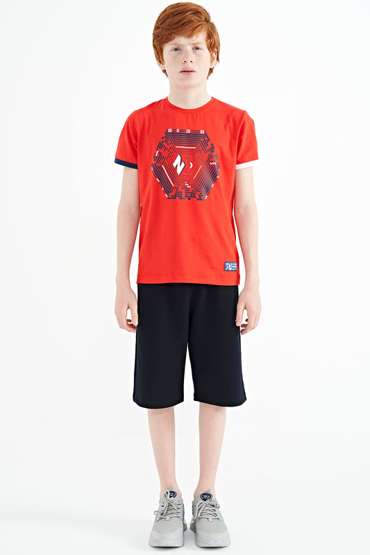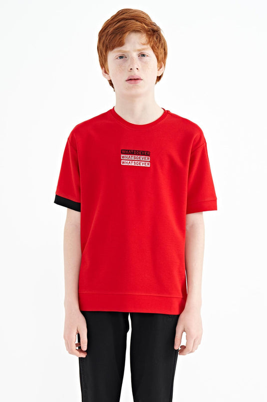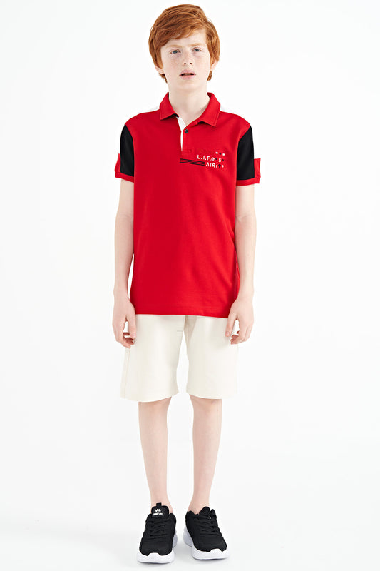 Red Color Blocked Shoulder Trim Detailed Standard Pattern Boys T-Shirt - 11155