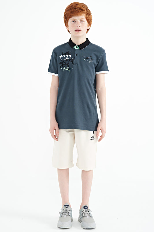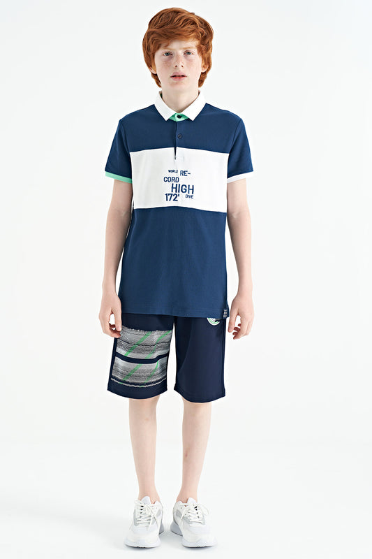 Navy Blue Print Detailed Polo Collar Standard Fit Boys T-Shirt - 11161