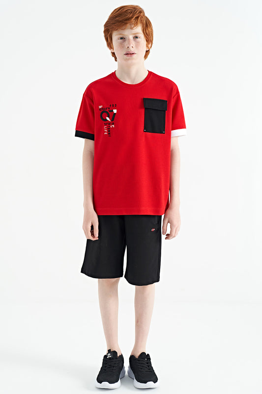 Red O Collar Oversize Pocket Detailed Boys T-Shirt - 11152