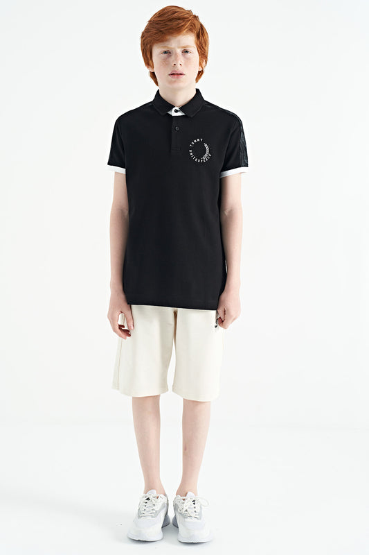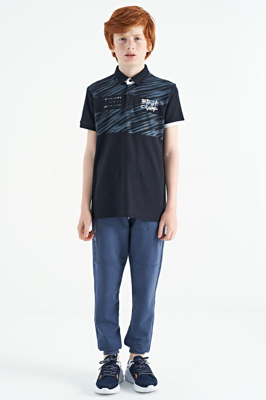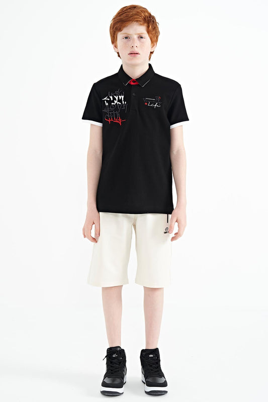 Black Print Detailed Polo Collar Standard Cut Boys' T-Shirt - 11166