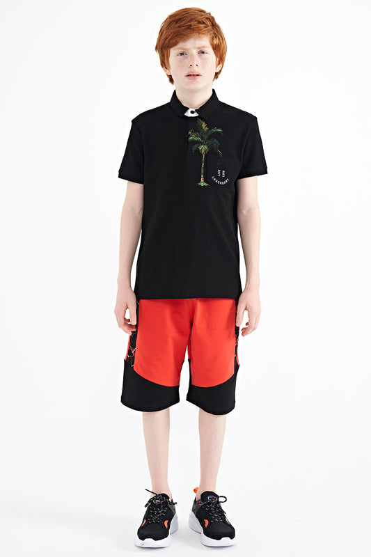 Black Printed Pocket Detailed Standard Fit Polo Collar Boys' T-Shirt - 11144