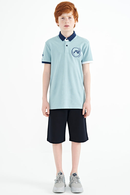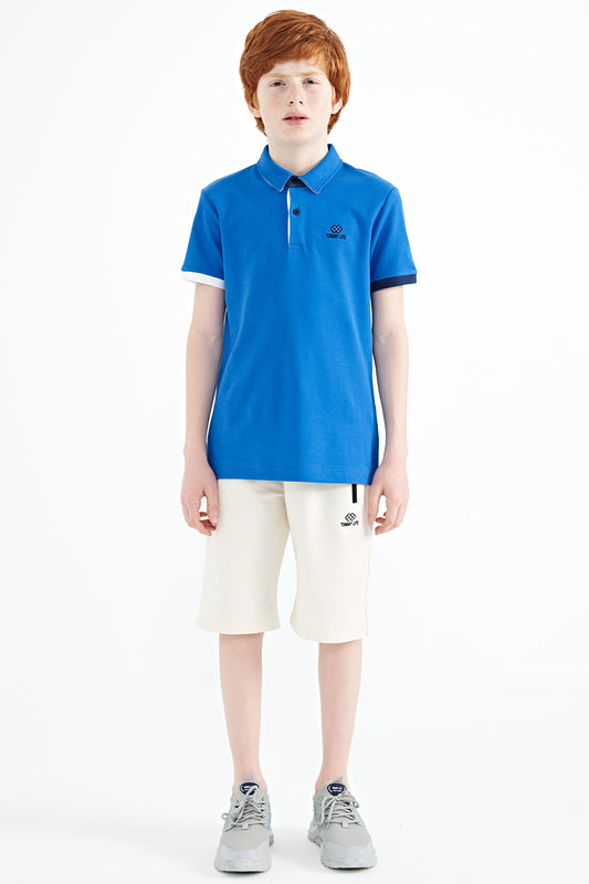 Light Blue Cuff Colored Logo Embroidered Standard Fit Polo Collar Boys T-Shirt - 11138