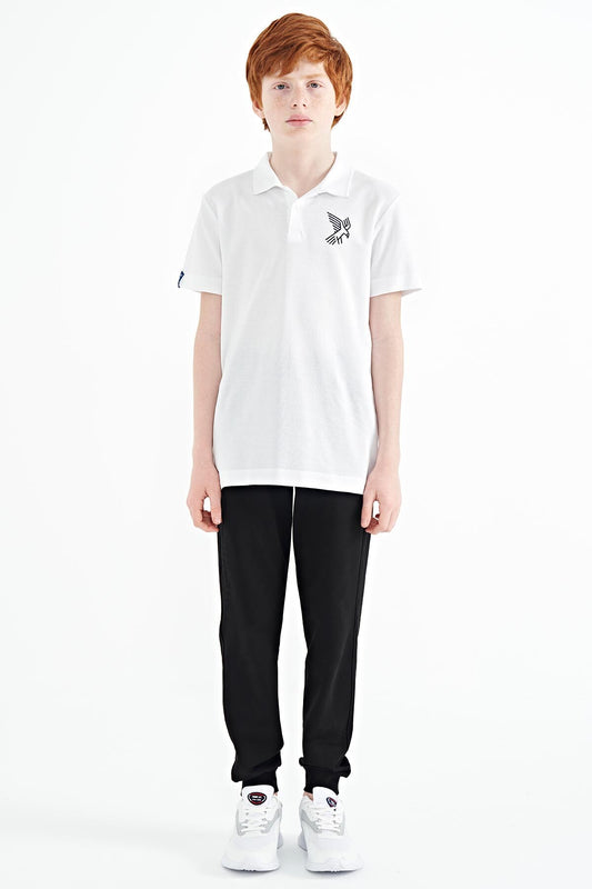 White Minimal Embroidery Detailed Standard Fit Polo Collar Boys T-Shirt - 11084