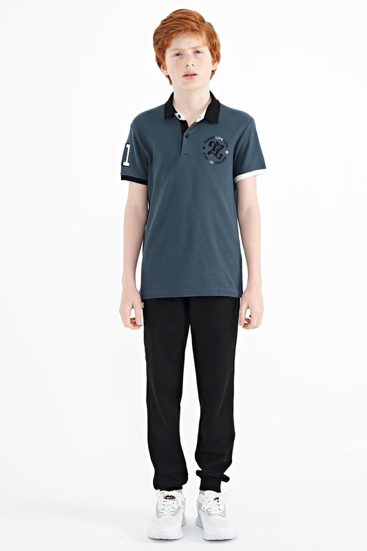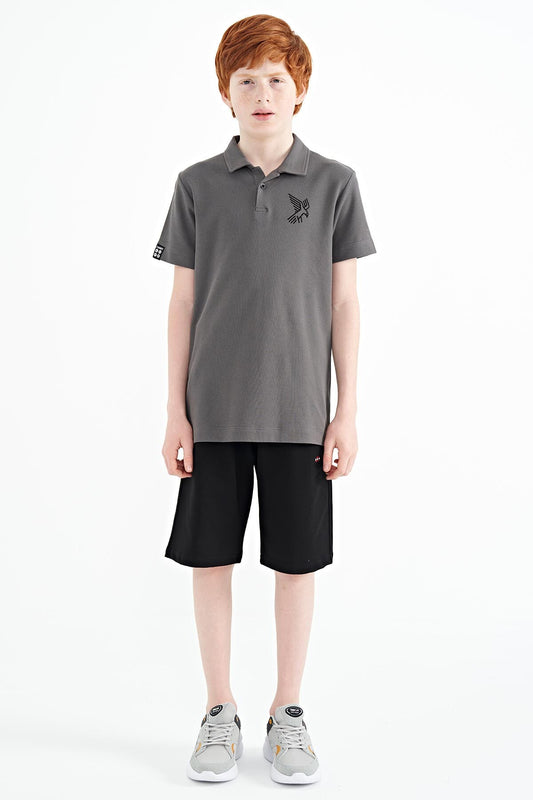 Dark Gray Minimal Embroidery Detailed Standard Pattern Polo Collar Boys T-Shirt - 11084