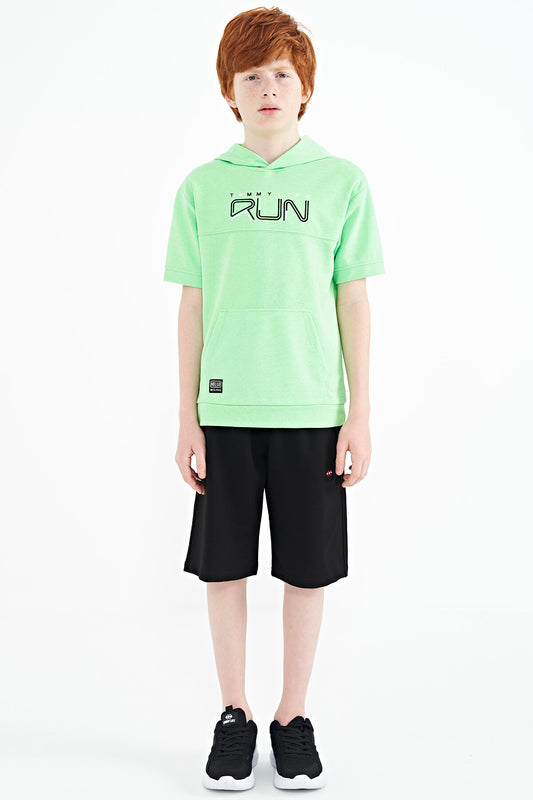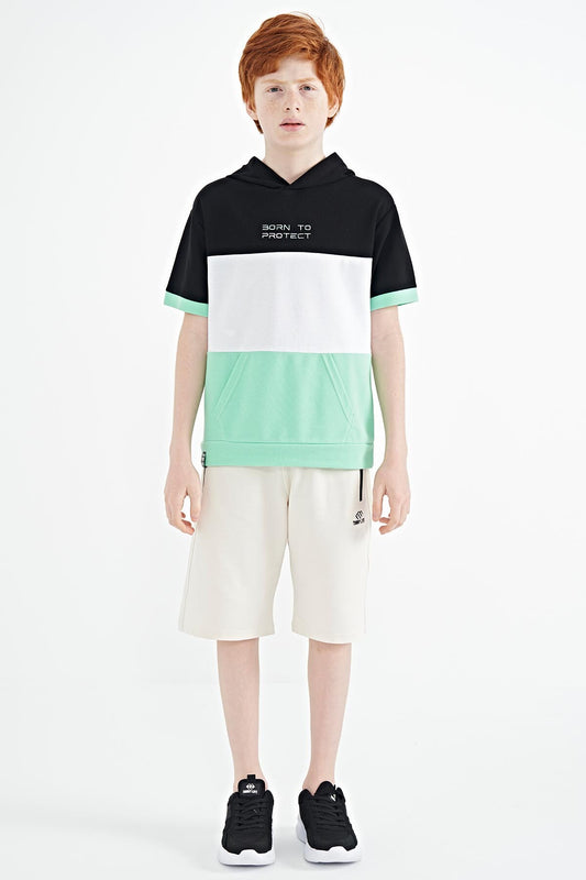 Green Block Color Kangaroo Pocket Hooded Oversize Boys T-Shirt - 11150