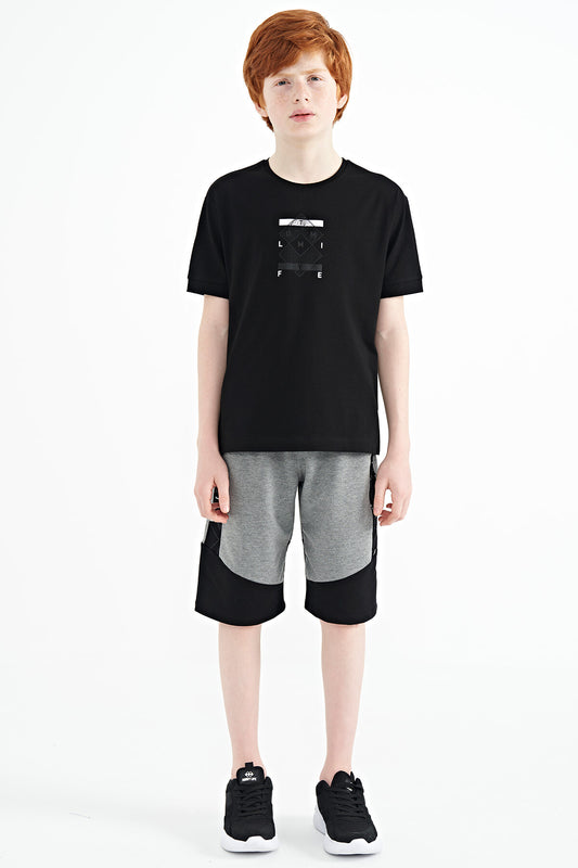 Black Detailed Printed Oversize Boys' T-Shirt - 11137