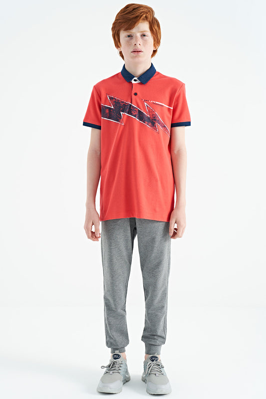 Coral Print Detailed Standard Mold Polo Collar Boys T-Shirt - 11154
