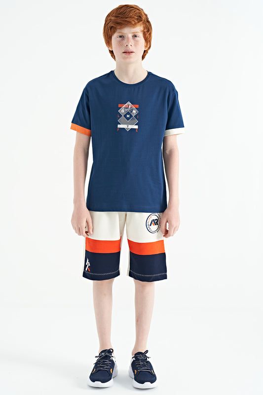 Orange Print Detailed O Collar Standard Cut Boys' T-Shirt - 11104