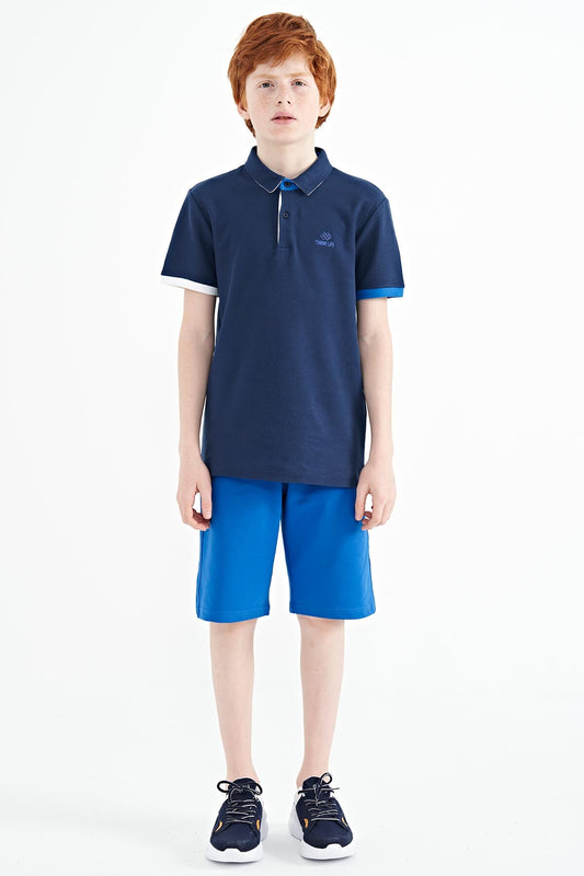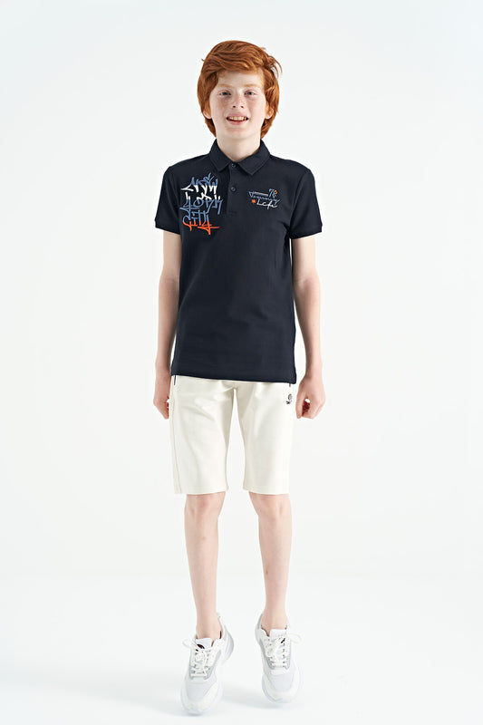 Navy Blue Embroidered Detailed Standard Cut Polo Collar Boys' T-Shirt - 11085