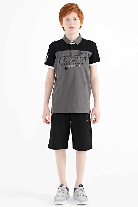 Dark Gray Color Block Letter Embroidery Standard Fit Polo Collar Boys T-Shirt - 11087