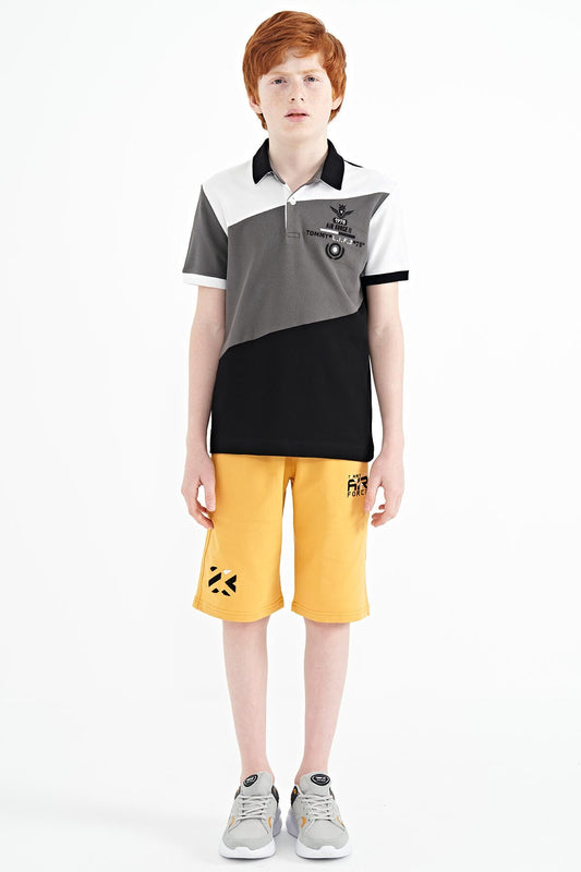 Black Color Block Embroidered Detailed Standard Pattern Polo Collar Boys T-Shirt - 11088