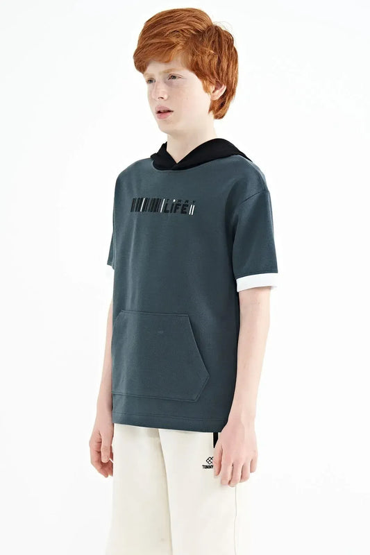 Forest Green Color Block Hooded Kangaroo Pocket Oversize Boys T-Shirt - 11148