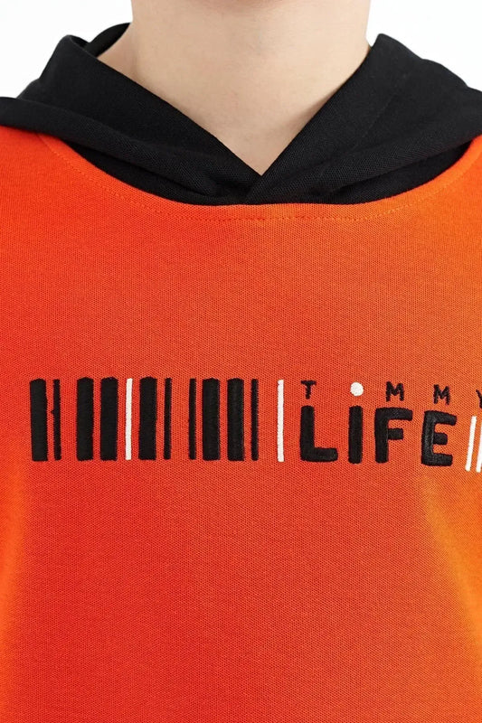 Orange Color Block Hooded Kangaroo Pocket Oversize Boys T-Shirt - 11148