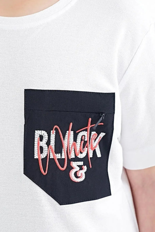 White Front Pocket Embroidered O Neck Standard Fit Boys T-Shirt - 11116