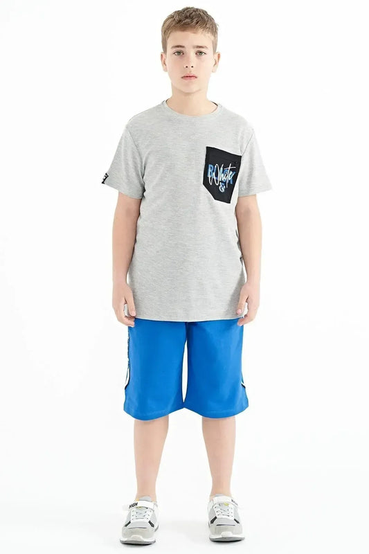 Blue Front Pocket Embroidered Detailed O Collar Standard Fit Boys T-Shirt - 11116
