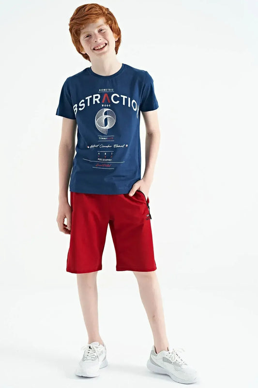 Indigo Print Detailed O Collar Standard Cut Boys' T-Shirt - 11103