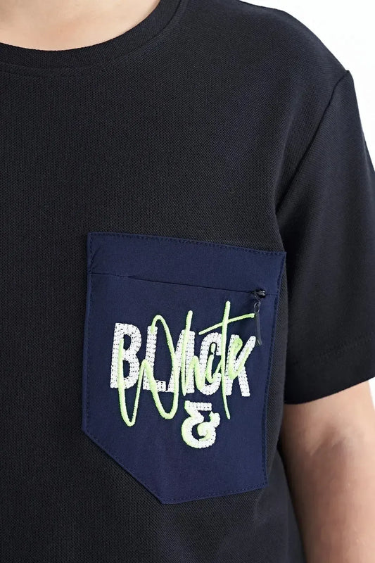 Black Front Pocket Embroidered O Collar Standard Fit Boys T-Shirt - 11116