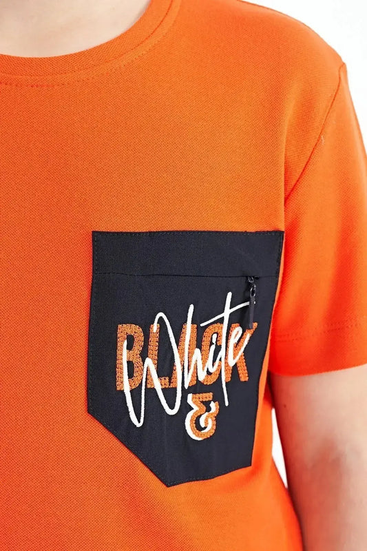 Orange Front Pocket Embroidered Detailed O Collar Standard Fit Boys' T-Shirt - 11116