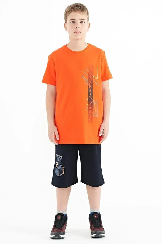 Orange Print Detailed O Collar Standard Cut Boys' T-Shirt - 11103